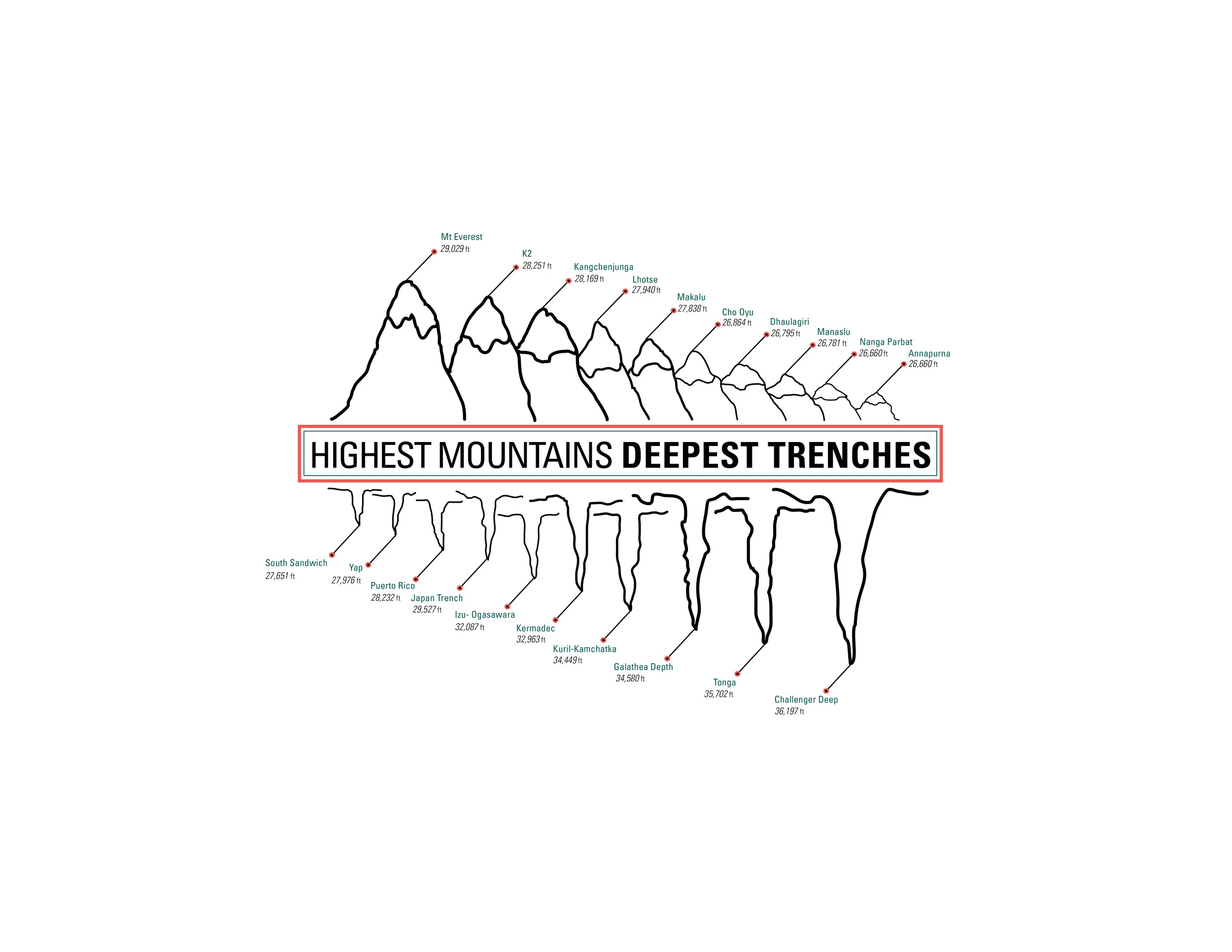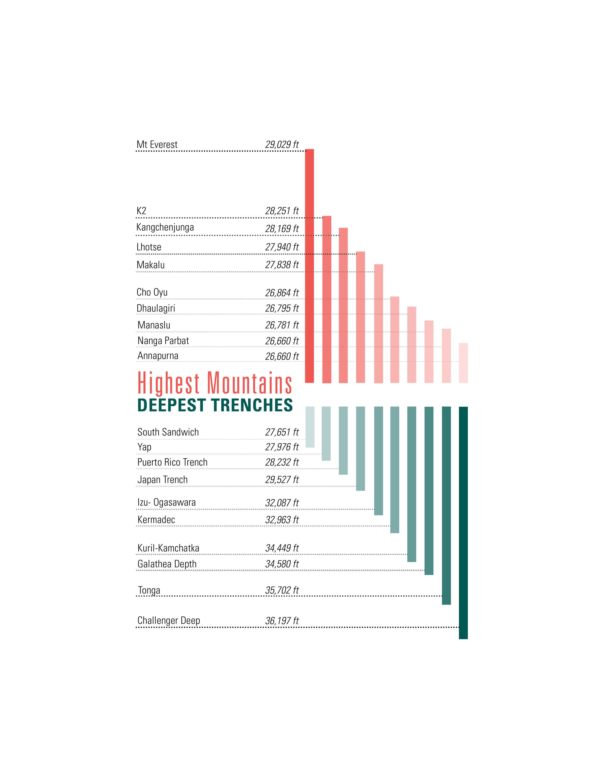 Info graphics of the world's Highest Mountains and Deepest Trenches.